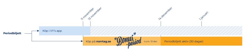 Under perioden kan du endast köpa en periodbiljett med den 14 december som tidigaste aktiveringsdatum – Men du får resa på biljetten från dagen du har köpt den. Exempel: Köper du en periodbiljett den 11 november så får du resa på den fram till den 13 januari.